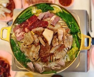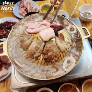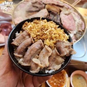 หลายร้านเปลี่ยนไปใช้เตาสมัยใหม่กันหมดแล้ว แต่ที่นี่ยังคงใช้ กระทะทองเหลืองแบบดั้งเดิม อยู่ครับ มันสุกช้ากว่านิดหน่อย แต่ผลคือน้ำมันจากหมูสามชั้นค่อย ๆ หยดลงส่วนน้ำซุประหว่างปิ้ง ทำให้ซุปหอมและข้นขึ้นเรื่อย ๆ ตลอดมื้อ ยิ่งนั่งนานยิ่งอร่อย ถ้าชอบซุปข้นหอม ๆ จะรู้สึกได้เลยครับ