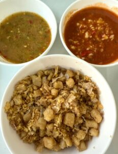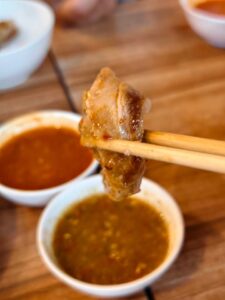 นี่คือจุดแรกที่ทำผมตกใจครับ น้ำจิ้มที่เสิร์ฟมาไม่ใช่น้ำจิ้มซีฟู้ดทั่วไป แต่เป็น น้ำจิ้มข่า สูตรเฉพาะของร้านที่มีกลิ่นข่าหอมชัดเจน รสกลมกล่อม ดึงรสหมูออกมาได้ดีทั้งแบบปิ้งและแบบต้ม คนมาครั้งแรกอาจงงนิดหน่อย แต่พอลองแล้วจะเข้าใจเลยว่าทำไมลูกค้าขาประจำถึงกลับมาซ้ำ — ผมซดน้ำจิ้มตรง ๆ แยกต่างหากเลยด้วยครับ